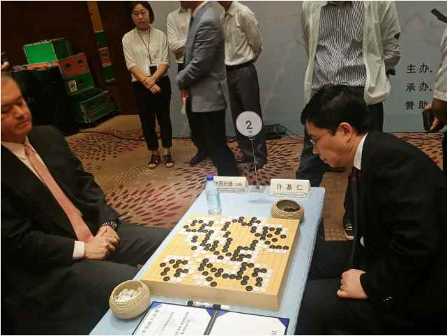 本文作者许基仁(右一)与日本九段棋手依田纪基在让子棋中对弈